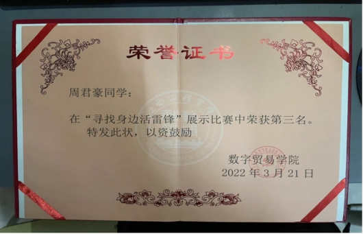 在校期间,我勤学习,勤思考,勇于创新。在平时学习生活中,我团结同学、助人为乐、顾全大局、诚实谦虚,在青年中起到表率作用。在2022年5月荣获“自立自强 诚实守信 知恩感恩”学生资助主题演讲比赛第三名;在思想上,我自觉遵守校规校纪,乐观向上,富有创造力,积极向党组织靠拢。在学院组织的“寻找身边的活雷锋”展示比赛中荣获第三名。