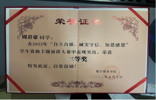 4.“自立自强,诚实守信,知恩感恩”演讲比赛第三名