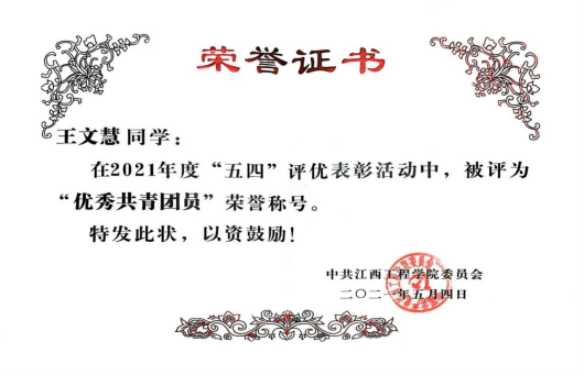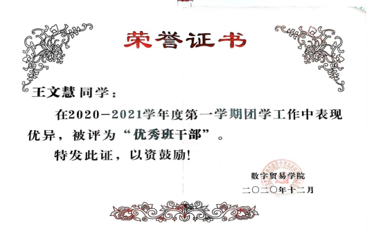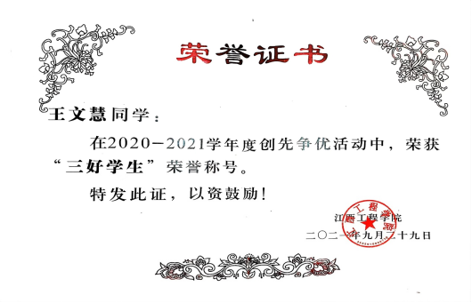 王文慧对待学习有信心、有毅力。“立身以立学为先,立学以读书为本”,她深知作为学生要以学习为本,无论是想实现自身的价值,还是想在社会中能够具有竞争力,都必须要有良好的专业知识作为基础。也深知“学问未必全在书本上”,所以注重培养自身实践能力以及全方位思考能力,有着明确的学习目标。大学学习成绩优秀,在班级能够起到一个模范带头作用,并多次获得“三好学生”、和“优秀共青团员”等称号,也获得过国家励志奖学金。在学好专业课的同时,努力提升自己的非专业能力,考取多项证书。“百里者半九十”,她面对所得荣誉,始终保持着一颗谦逊好学的心,保持着不骄不躁的心态。