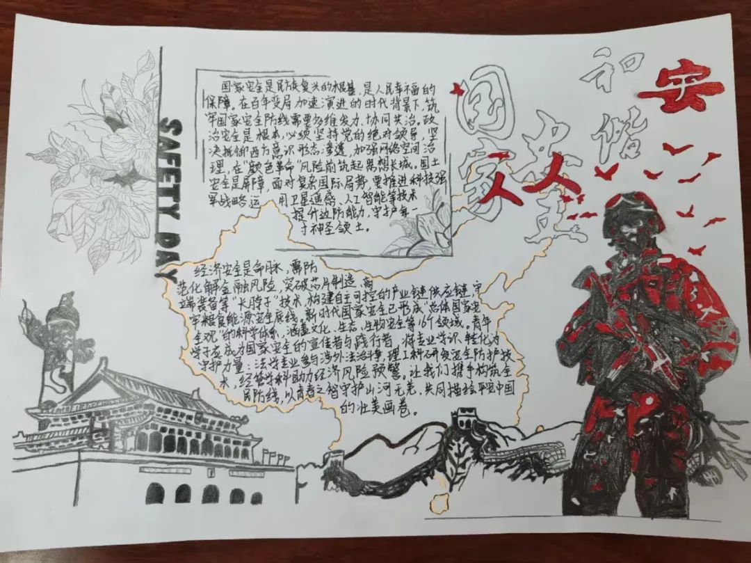 在此次“国家安全宣传教育”主题手抄报活动的准备过程中,同学们充分发挥了自己的创造力和想象力,将国家安全知识融入手抄报的版面设计和内容创作中。他们挑选了与国家安全相关的主题,如网络安全、军事安全等,并通过文字、图画等多种方式呈现。