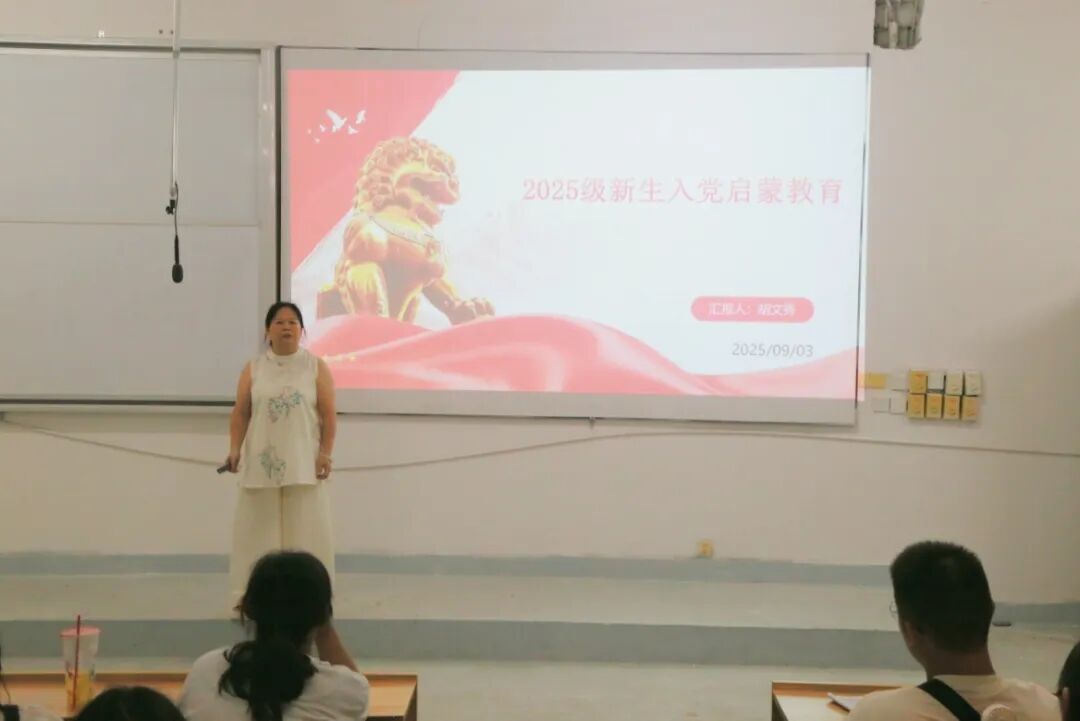 为帮助2025级新生扣好“思想成长的第一粒扣子”,深化对党的认识、点燃入党热情、树立正确入党动机,9月3日,经济管理学院于b106开展2025级新生入党启蒙教育活动。本次活动由学院党总支专职组织员、学生党支部书记胡文秀主讲,2025级全体新生参与。