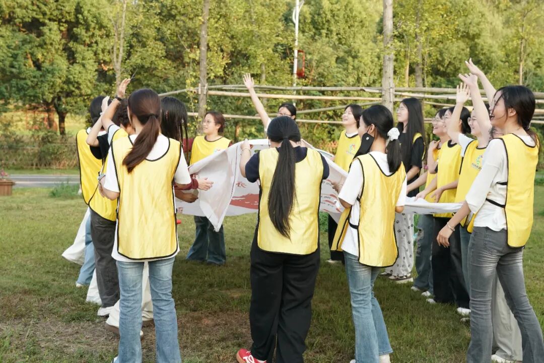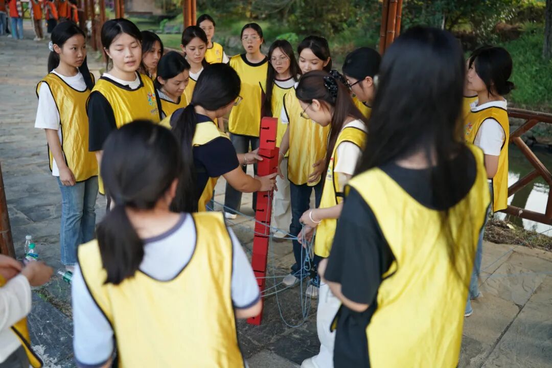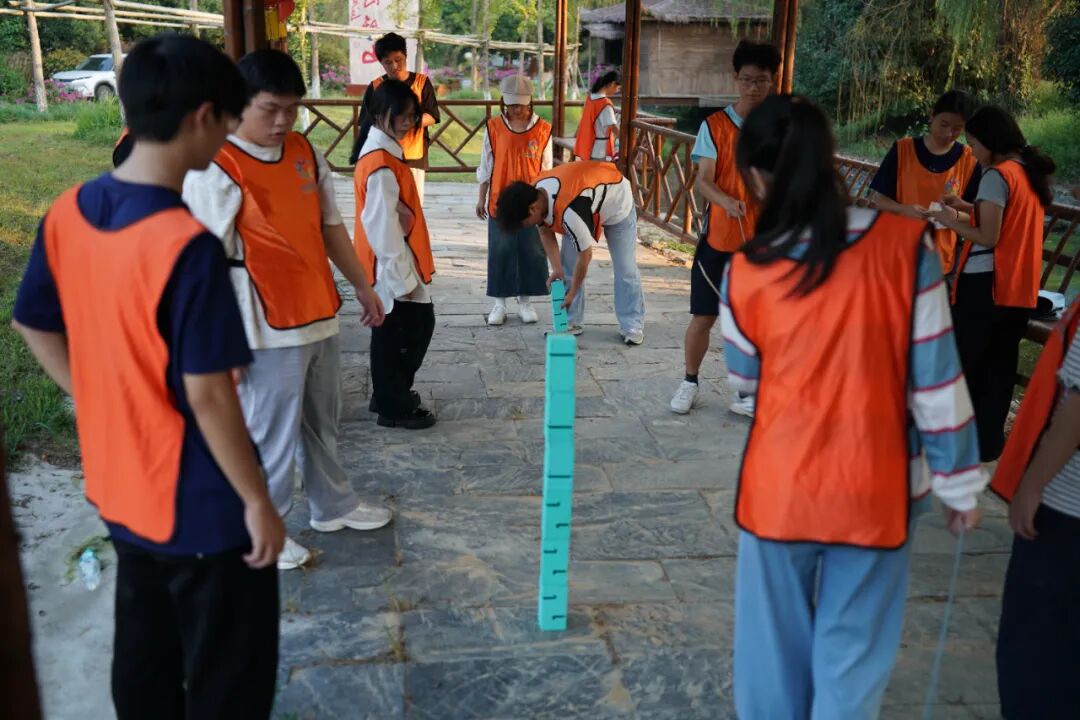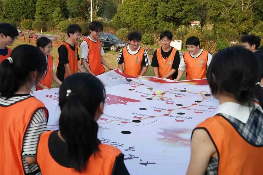 本次实践活动设置“合力筑塔”“重走长征路”“齐头并进” 三大红色拓展项目,将党性教育与实践锻炼深度融合:1.合力筑塔:模拟党组织建设过程,要求12 名队员通过精准配合、统一指挥,共同搭建9层“堡垒” 模型。通过项目实践,学员深刻认识到 “党的团结统一是战胜一切困难的根本保证”,进一步强化 “个人服从组织、少数服从多数” 的组织原则。2.重走长征路:以巨型党史地图为载体,串联“湘江血战”“遵义会议”“四渡赤水”等关键历史节点,要求学员在完成运球任务的同时,准确回答党史问题。通过沉浸式体验,学员重温长征历程,深刻感悟 “不畏艰难、勇于胜利”的长征精神,进一步坚定理想信念。3.齐头并进:通过50米踏板鞋接力,考验团队节奏与协作能力。项目实践中,学员切实体会 “步调一致才能得胜利” 的革命真理,强化“团结协作、共克时艰”的责任意识。