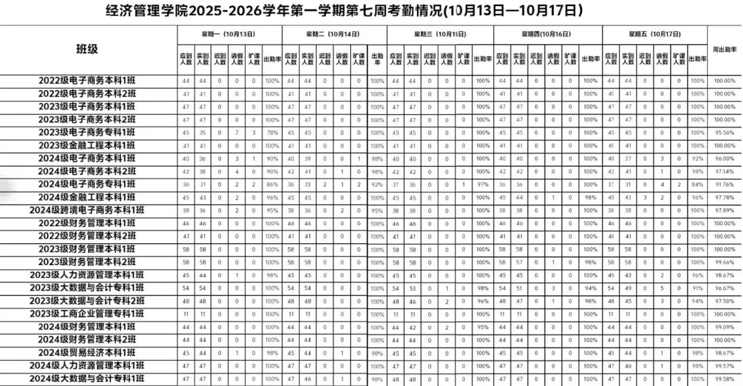 为进一步加强我院的学风建设,营造良好的学习氛围,助力同学们养成良好的学习习惯,本学期经济管理学院继续深入推进常态化课堂巡查制度,现将第七周课堂考勤情况通报如下: