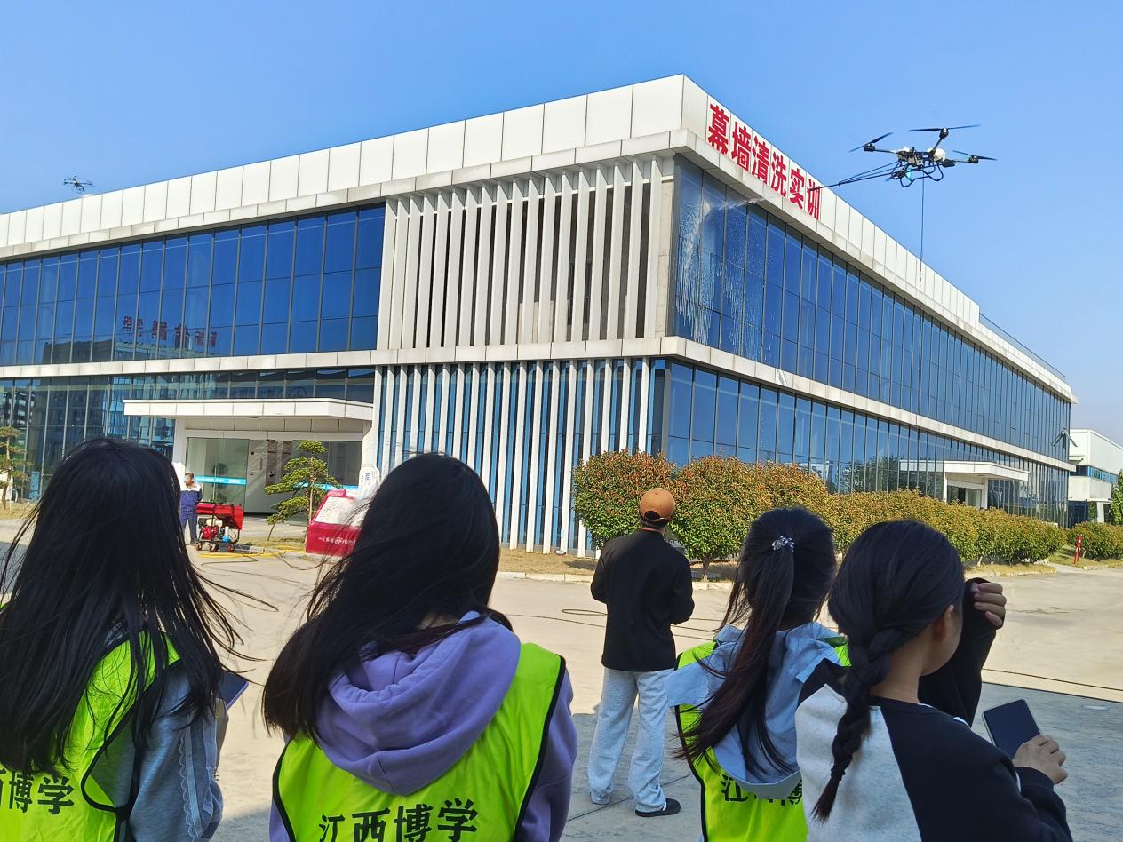 在无人机清洗幕墙玻璃的现场,无人机搭载着专业的清洗设备,沿着高楼大厦的外墙缓缓上升,对玻璃幕墙进行高效清洗。这一应用解决了高层建筑外墙清洗难度大、危险性高的问题,展现了无人机在城市清洁维护领域的独特优势。学生们看着无人机在高空中有条不紊地工作,不禁为科技的力量所折服,纷纷讨论起无人机在其他城市服务领域的应用可能性。