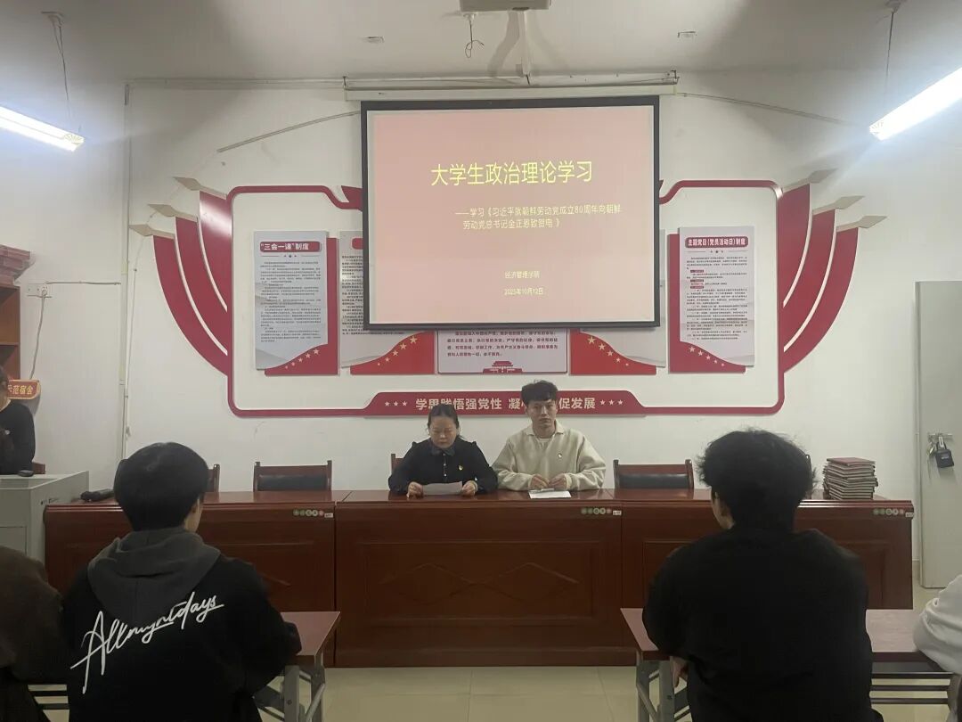 活动伊始,学生党支部书记胡文秀围绕“习近平就朝鲜劳动党成立80周年向朝鲜劳动党总书记金正恩致贺电”展开领学。她指出,习近平总书记的贺电,高度肯定了朝鲜劳动党成立80年来为朝鲜人民幸福和国家发展所作出的努力,以及为维护地区和世界和平稳定作出的积极贡献。胡文秀结合历史与当下,详细阐述了中朝两党两国传统友谊的深厚根基与时代价值。她谈到,中朝两国是山水相连的友好邻邦,中朝传统友谊由两国老一辈领导人亲手缔造并精心培育,是双方共同的宝贵财富。在新的历史时期,中朝两党两国将继续加强友好交流与合作,这不仅符合两国和两国人民的根本利益,也有利于地区乃至世界的和平、稳定与发展。鼓励同学们从贺电精神中汲取力量,以更广阔的全球视野、更强烈的责任担当,投身到学习和未来的工作中,为国家发展和人类进步事业贡献青春力量。
