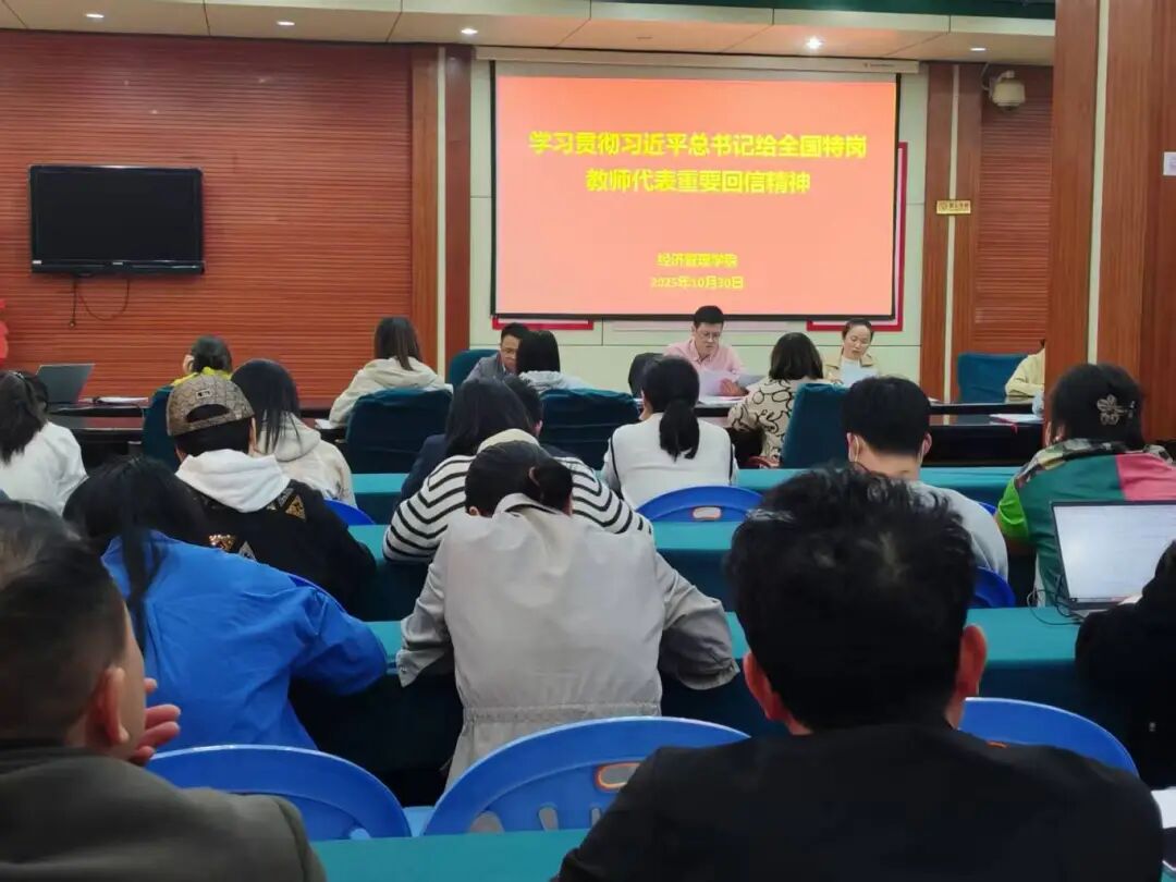 为提高全体教师的政治站位,深刻认识习近平总书记重要回信的重大意义。10月30日,经济管理学院召开学习贯彻习近平总书记给全国特岗教师代表重要回信精神会议。本次会议由经济管理学院院长谭文武主持,党总支书记张文凤,副院长朱伙军,邹莉及学院全体教师参加会议。