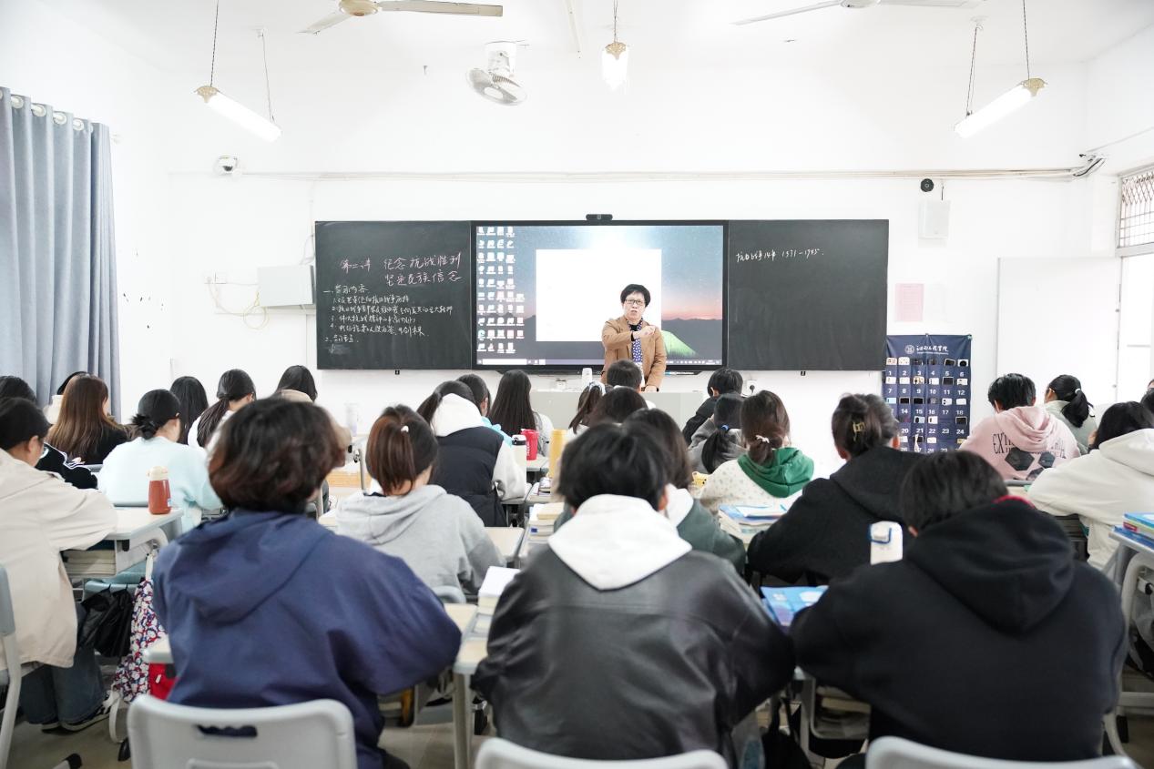 授课伊始,李凡教授以翔实史料与鲜活案例回顾抗战历程,剖析胜利的必然性,强调其是民族转折点与世界反法西斯战争的重要部分,是精神动力源泉;随后以平型关大捷等经典战例展现全民英勇抗争,称胜利是以弱胜强的奇迹、血肉筑成的长城;接着深入解读抗战精神,勉励青年传承担当精神、融入国家发展;课程尾声,李凡教授以“珍爱和平,开创未来”为结语,呼吁青年学子铭记历史教训,坚定维护世界和平,并深情朗诵了《松花江上》《义勇军进行曲》等经典作品,将课堂气氛推向高潮,现场气氛热烈,学生深受触动,表示将为国家发展贡献力量。