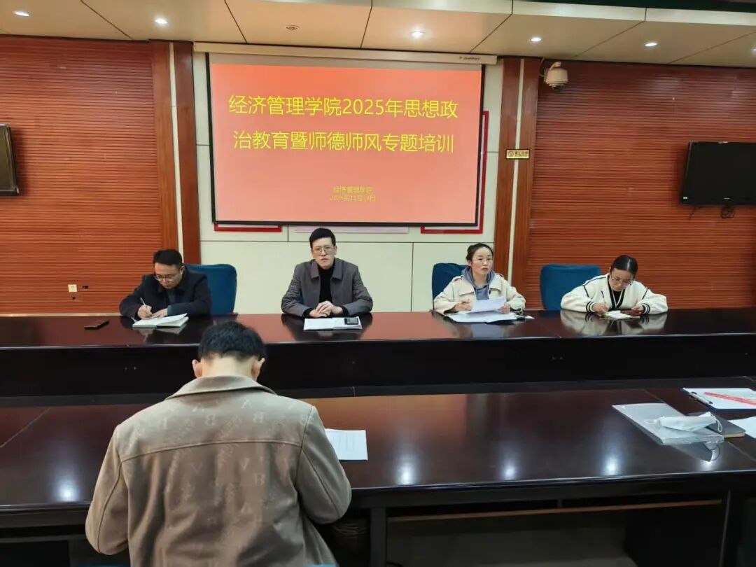 为深入贯彻落实党的二十届四中全会精神,全面加强师德师风建设,筑牢全体教职工为党育人、为国育才的思想根基,经济管理学院于11月19日下午在图文信息中心403会议室召开教师思想政治教育暨师德师风建设专题培训会,经济管理学院院长谭文武主持会议,党总支书记张文凤,副院长朱伙军、邹莉及学院全体教师参加会议。