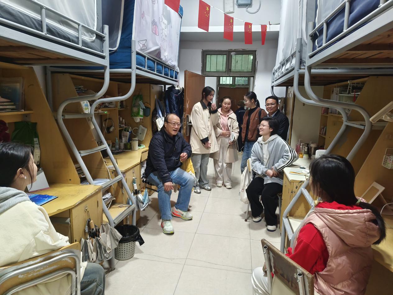 在宿舍联系中,刘新跃实地察看14栋学生住宿环境,详细询问同学们思想学习生活状况,认真征集对宿舍条件、后勤保障等工作的意见建议。在14栋D214宿舍,他与学生畅谈家乡变化、分享假期见闻,细致了解大家的阶段性目标规划,勉励同学们珍惜学习时光,与室友互帮互助、和谐相处,以饱满热情投入学习生活,实现自我提升。