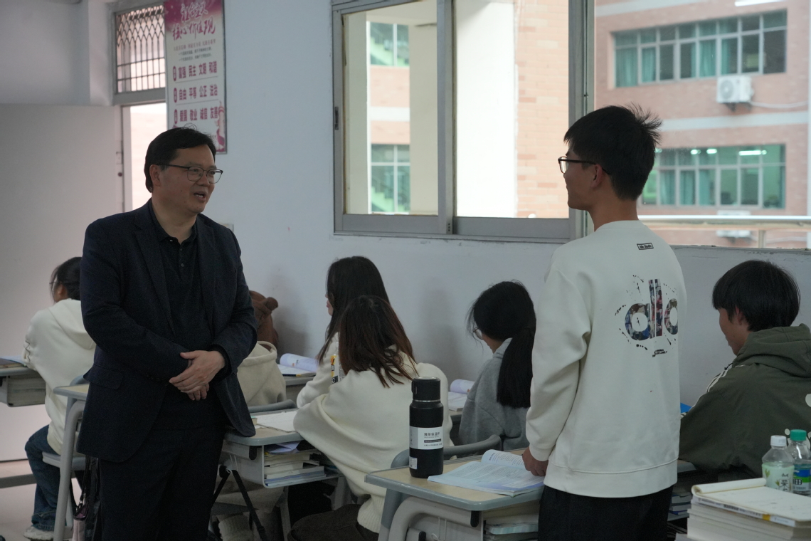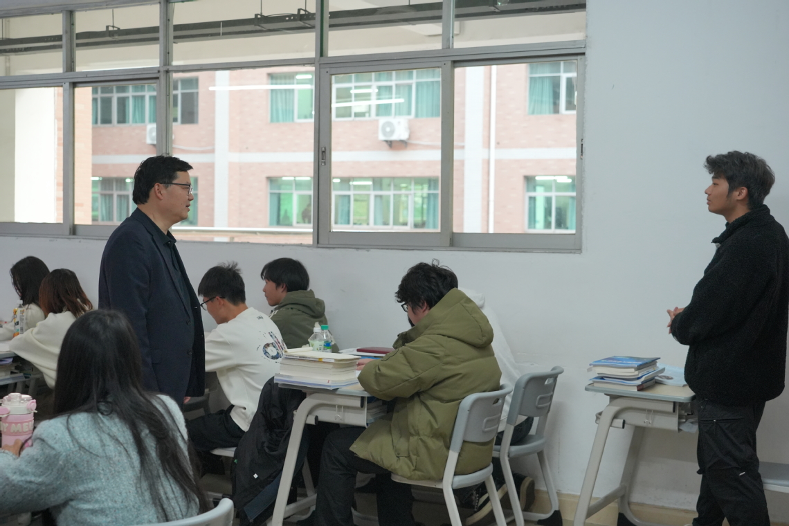 魏建克首先来到其联系班级——2024级跨境电子商务本科1班。他面带微笑与同学们亲切交流,详细询问专业课程设置、学习进度等情况,关切地了解大家在学习中遇到的难点堵点及对课程安排的优化建议;耐心倾听同学们分享学习生活中的感悟,悉心叮嘱大家养成规律作息、勤学善思的良好习惯;特别关注班级入党积极分子的理论学习进展,勉励他们以党员标准严格要求自己,坚定理想信念,用实际行动争取早日加入党组织。