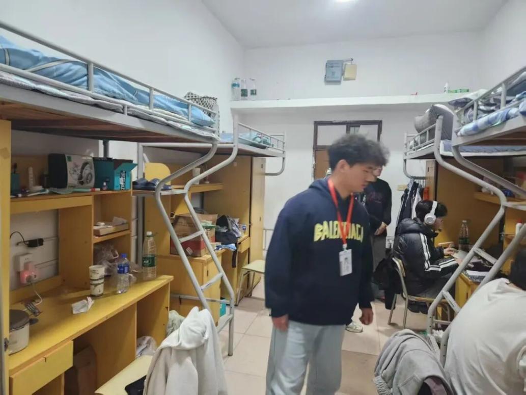 同学们分工明确,将物品分类摆放整齐、垃圾及时清理,并整理个人桌面、床铺,确保卫生无明显死角。查寝人员全程佩戴工作标识,敲门示意、文明用语,用客观公正的态度记录细节,“严标准”里藏着的,是对每间寝室的用心守护。