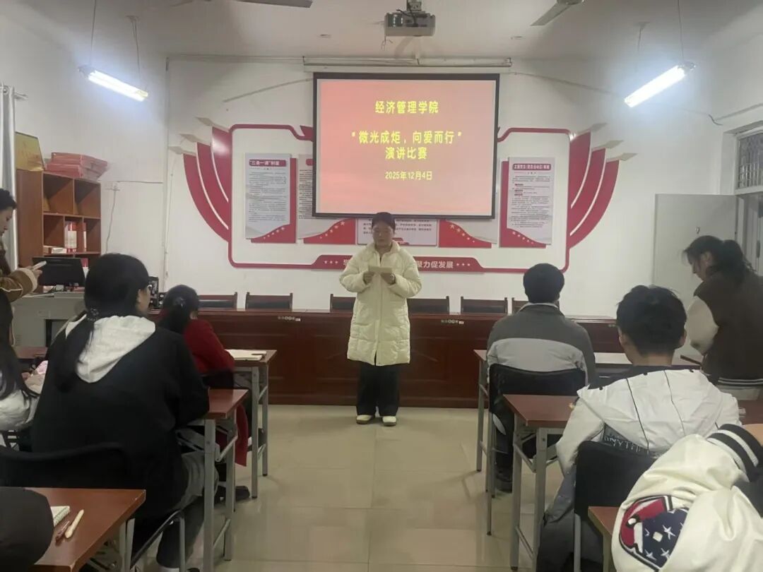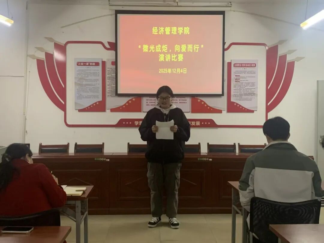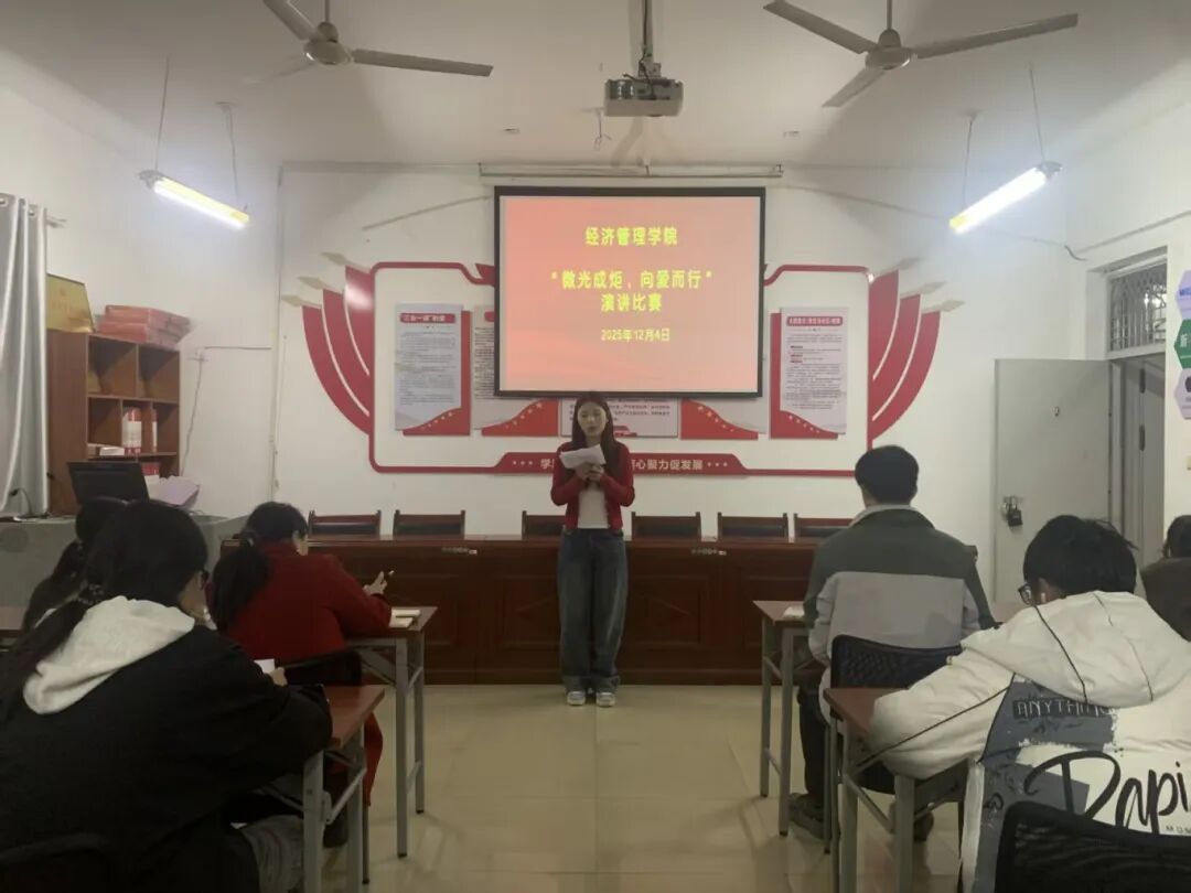 为弘扬志愿公益精神,发掘其中饱含温度的感人故事,引导同学们感悟善意温暖、厚植奉献情怀,同时丰富校园文化生活、增强集体凝聚力。2025年12月4日,经济管理学院在A401教室组织开展“微光成炬,向爱而行”演讲比赛。同学们积极参与。