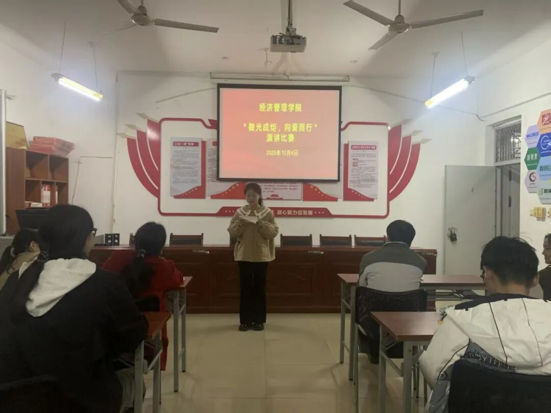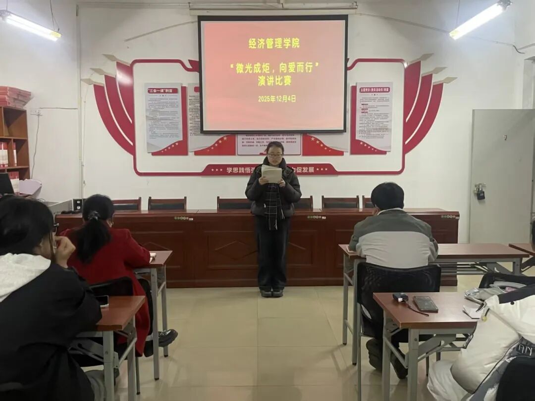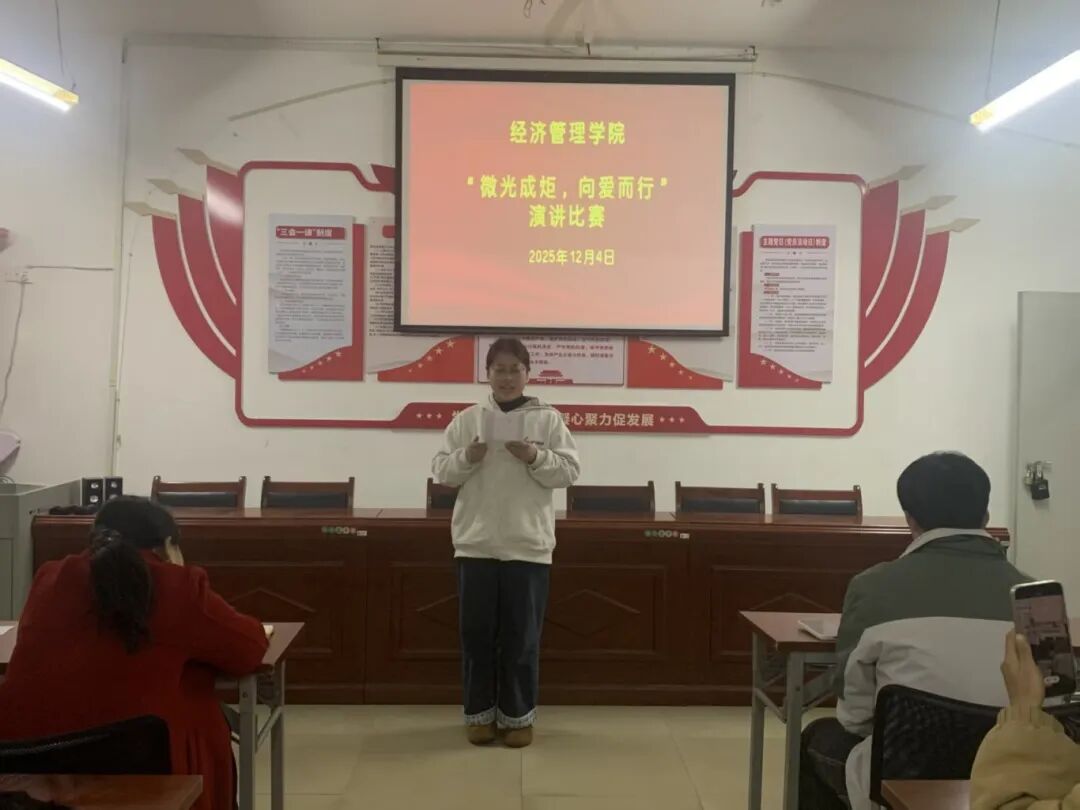 为弘扬志愿公益精神,发掘其中饱含温度的感人故事,引导同学们感悟善意温暖、厚植奉献情怀,同时丰富校园文化生活、增强集体凝聚力。2025年12月4日,经济管理学院在A401教室组织开展“微光成炬,向爱而行”演讲比赛。同学们积极参与。