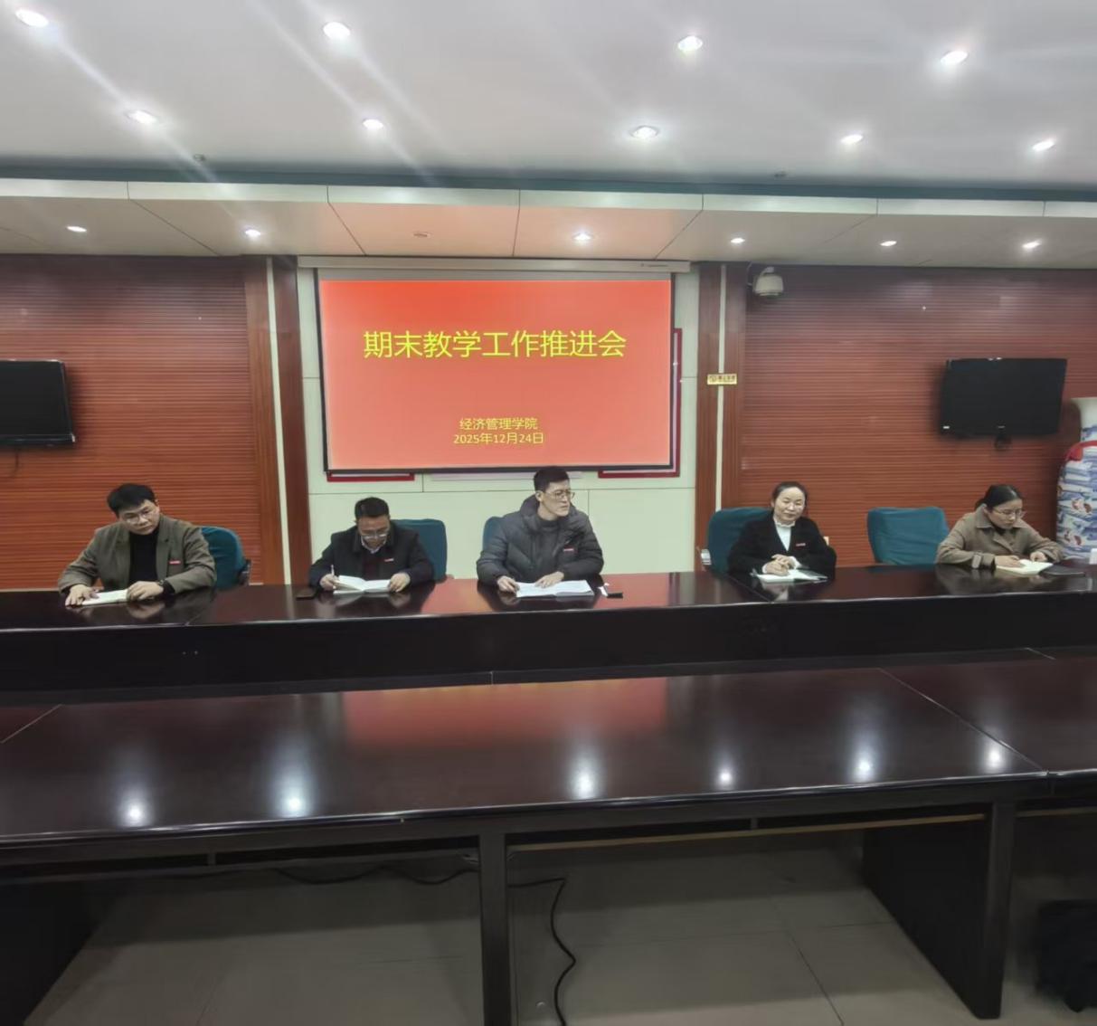 2025年12月24日下午,经济管理学院在图书馆403会议室召开期末教学工作推进会,全面部署学期末各项教学任务,聚力提升育人质量,确保学期工作圆满收官。学院院长谭文武,党总支书记张文凤,党总支副书记郭远峰,副院长邹莉、朱伙军及全体教师参会。会议由院长谭文武主持。