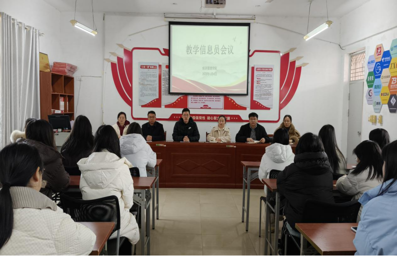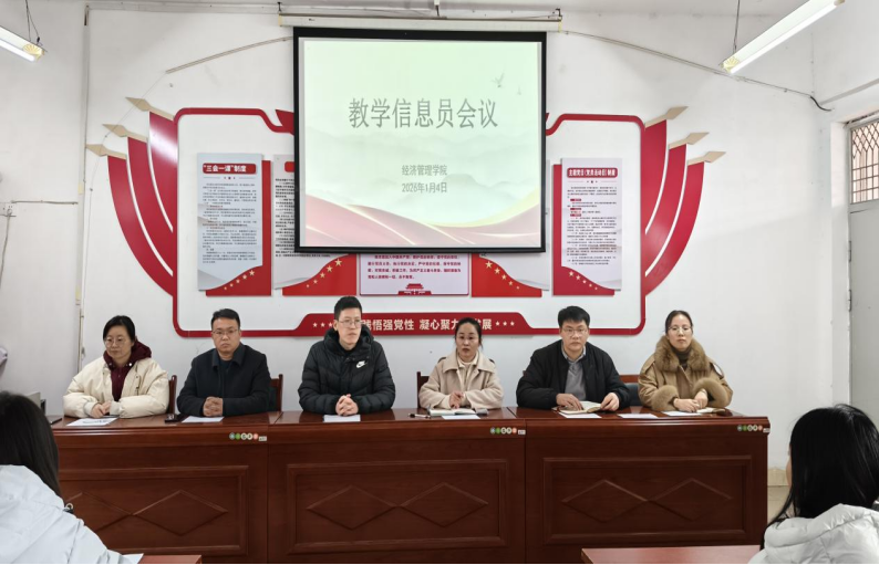 2026年1月4日上午,经济管理学院在A栋401会议室召开期末教学信息员座谈会。会议由学院教学督导员蔡卉主持,学院院长谭文武,党总支书记张文凤,副院长朱伙军、邹莉,党总支副书记郭远峰,教学督导员胡艳芳以及各班级教学信息员参会。