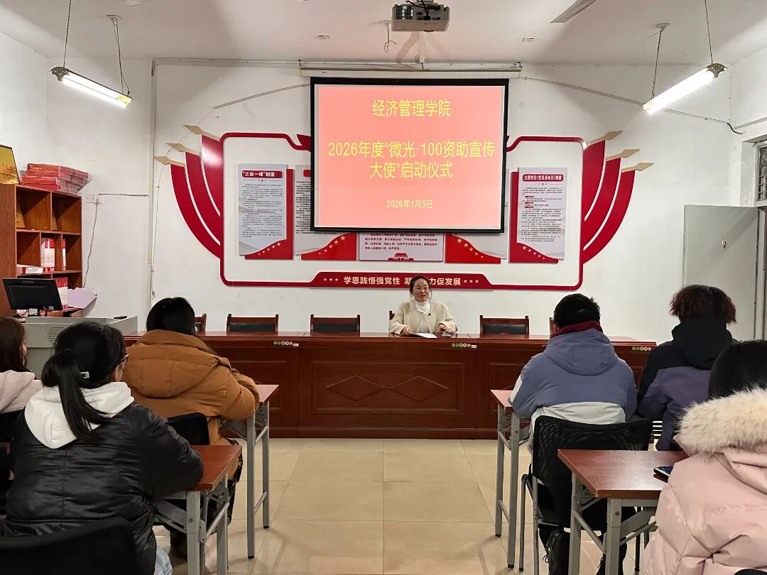 为深入贯彻落实国家资助政策,进一步加大学生资助宣传力度,深化资助育人实效,鼓励受助学生积极践行社会责任,提升感恩意识与奉献精神,2026年1月5日,经济管理学院在A401会议室举办“微光·100资助宣传大使”寒假宣传实践活动启动会。会议由学院党总支书记张文凤主持,学院全体入选“微光·100资助宣传大使”的学生参加。
