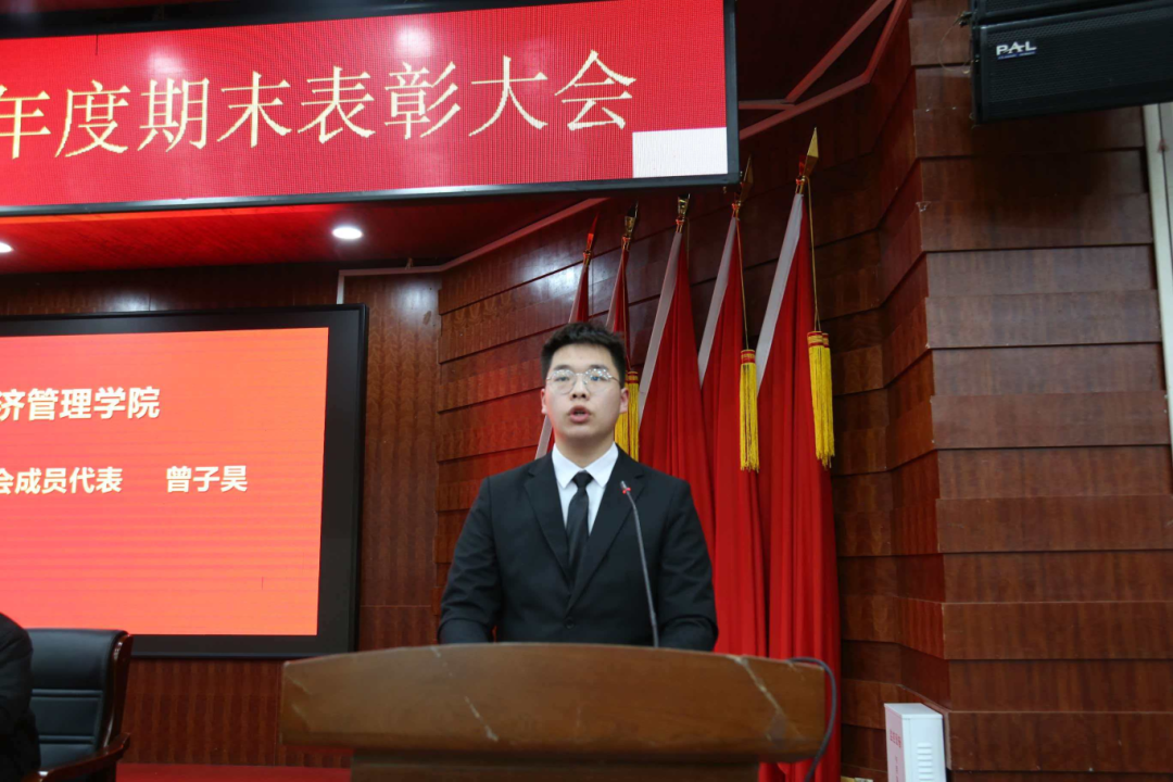 大会第七项议程,团学代表曾子昊讲话,他提出:我们会主动向前辈请教工作经验,向身边同学学习优点和长处,在一次次实践中积累经验、打磨能力;会以一丝不苟的认真态度对待每一项工作,从活动策划的框架搭建到执行落地的细节把控,从日常服务的点滴小事到大型活动的统筹协调,都做到精益求精、把细节做扎实;会以团结之心凝聚团队力量,打破部门间的沟通壁垒,让成员之间互帮互助、部门之间协同配合,让团学组织成为一个紧密协作、高效运转的集体。