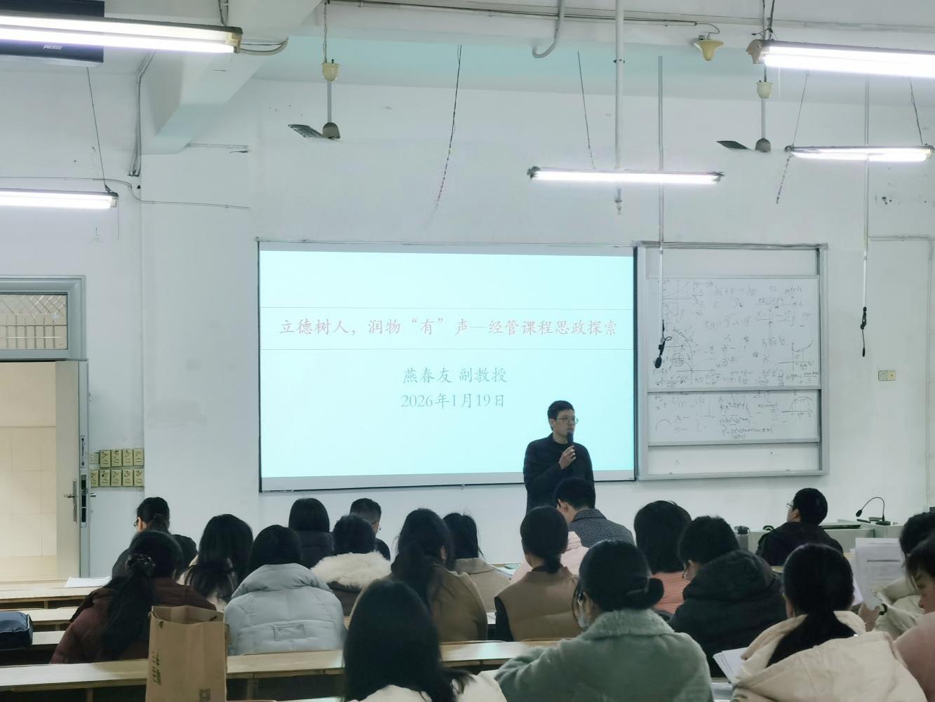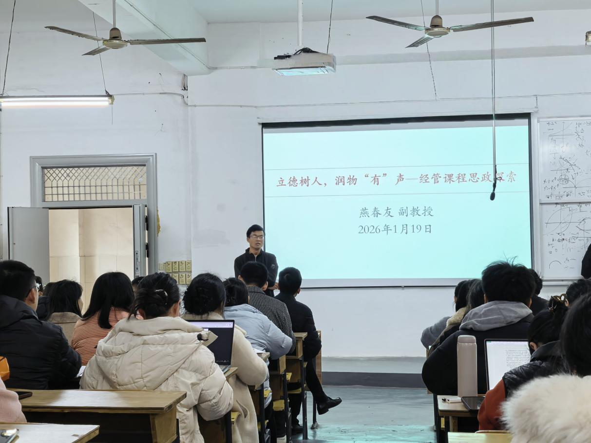 为深入贯彻落实立德树人根本任务,推动课程思政与专业教学深度融合,提升教师课程思政教学能力,1月19日上午9:00,经济管理学院在C105教室举办课程思政建设公开课。本次公开课由学院副教授燕春友主讲,学院院长谭文武主持,学院全体教师共同参与学习。