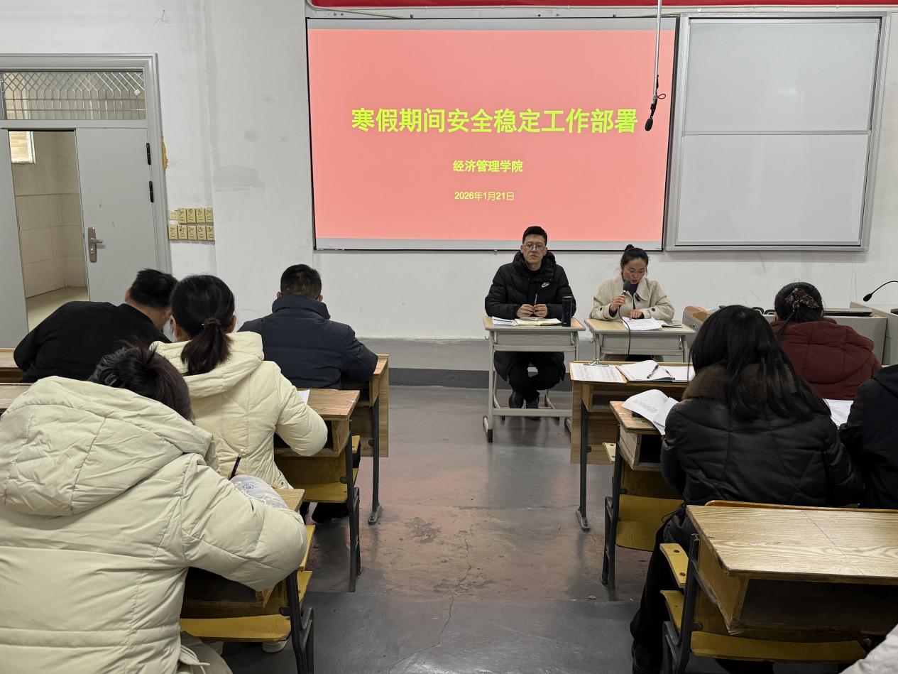 为切实做好2025-2026学年寒假前后各项学生管理工作,筑牢校园安全防线,保障师生度过平安、充实的假期。1月21日下午,经济管理学院在C105多媒体教室召开寒假期间安全稳定工作部署会。学院院长谭文武主持会议,党总支书记张文凤作具体工作部署,学院全体教师参加,共同为学院寒假安全稳定工作出谋划策、保驾护航。