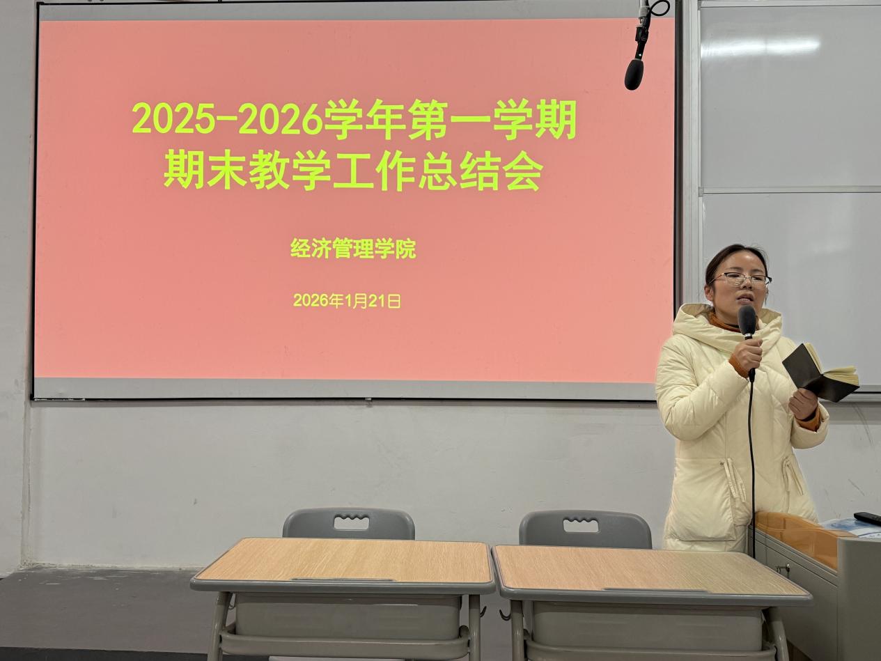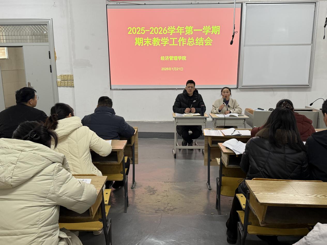 为全面梳理总结本学期学院各项工作的成果与经验,科学谋划2026年工作方向及重点任务,1月21日下午,经济管理学院在C105多媒体教室召开了2025-2026学年第一学期期末教学工作总结会。本次会议由学院院长谭文武主持,学院党政领导班子成员、全体教师及辅导员(班主任)齐聚一堂,共同回顾本学期教学工作的点点滴滴,展望未来的发展方向。