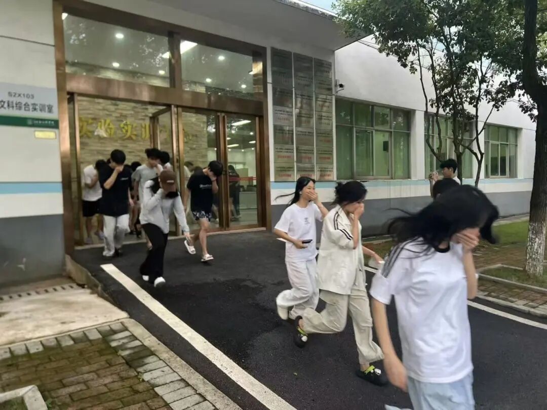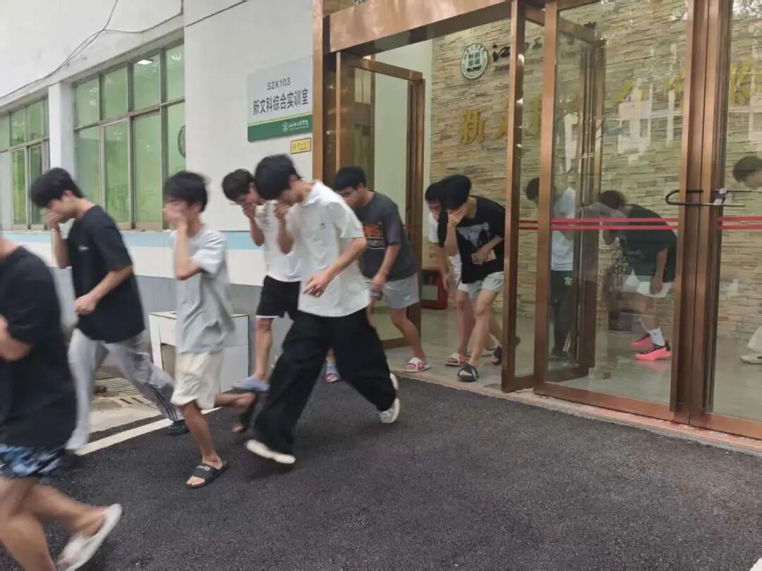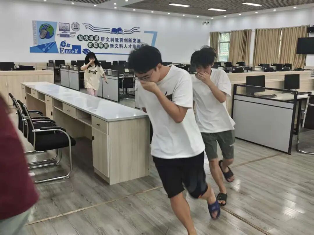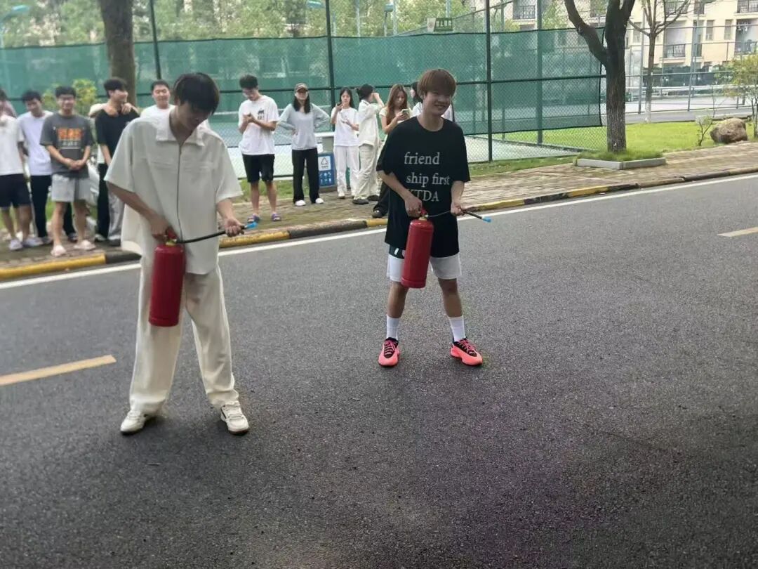 学校平安校园建设负责人结合新文科实验室用电密集、设备繁多的特点,先带大家细致排查潜在火灾隐患,再手把手拆解灭火器“提拔握压”四步法。模拟火情一启动,同学们迅速进入状态:有的负责确认逃生通道,有的提醒同伴捂好口鼻弯腰前行,短短3分钟就全员安全撤离到指定区域。到了实操环节,大家更是踊跃上阵,在工作人员的指导下对准模拟火盆根部灭火,亲身感受灭火器材的使用方法和关键要点。