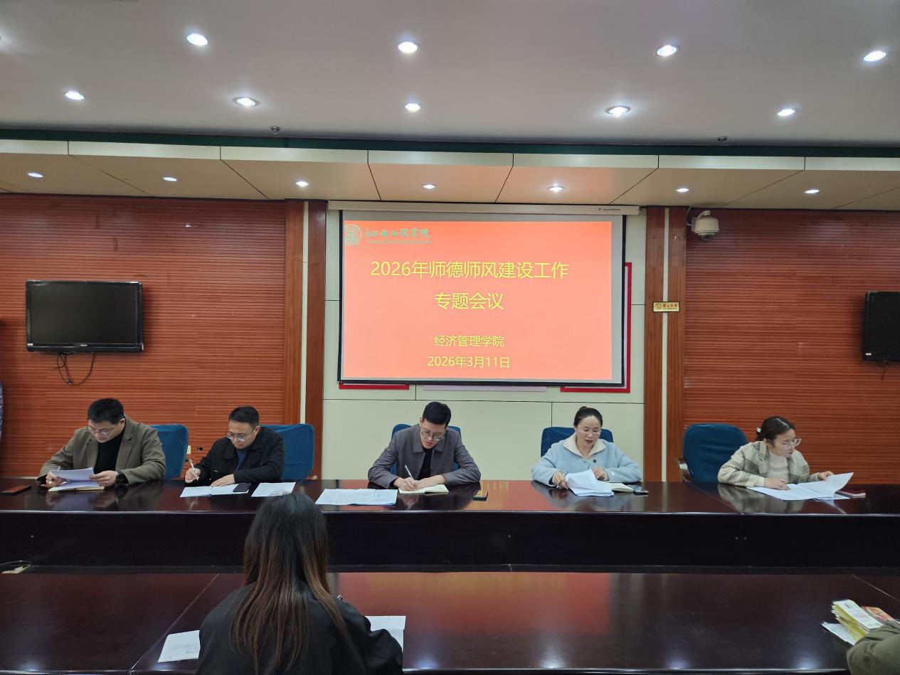 为深入贯彻落实国家关于新时代高校教师队伍建设与师德师风建设的相关要求,全面提升教师思想政治素质与职业道德水平,2026年3月25日,经济管理学院召开2026年师德师风建设工作专题会议。会议由党总支书记张文凤主持,学院领导班子成员、全体教师参加。