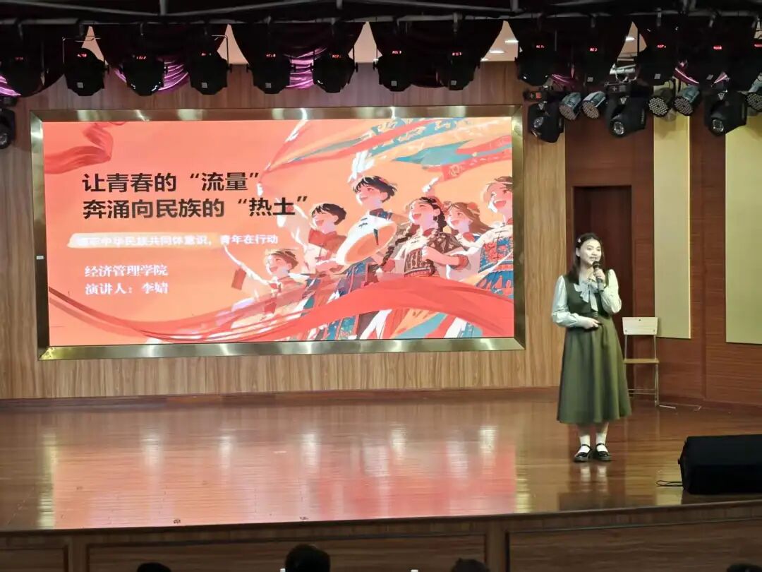 为深入贯彻落实习近平总书记关于加强和改进民族工作的重要思想,积极响应将铸牢中华民族共同体意识全面融入学校育人全过程的号召,引导广大学生切实增强对中华民族共同体的认同感与归属感,4月1日14:30,一场意义非凡的“青春聚力民族团结,同心共筑复兴华章”铸牢中华民族共同体意识主题演讲比赛校赛在热烈的氛围中拉开帷幕。经济管理学院在前期精心组织学院初赛的基础上,选派优秀学子参与此次校赛,最终取得优异成绩,潘逸晨和李婧两位同学双双荣获校赛二等奖。