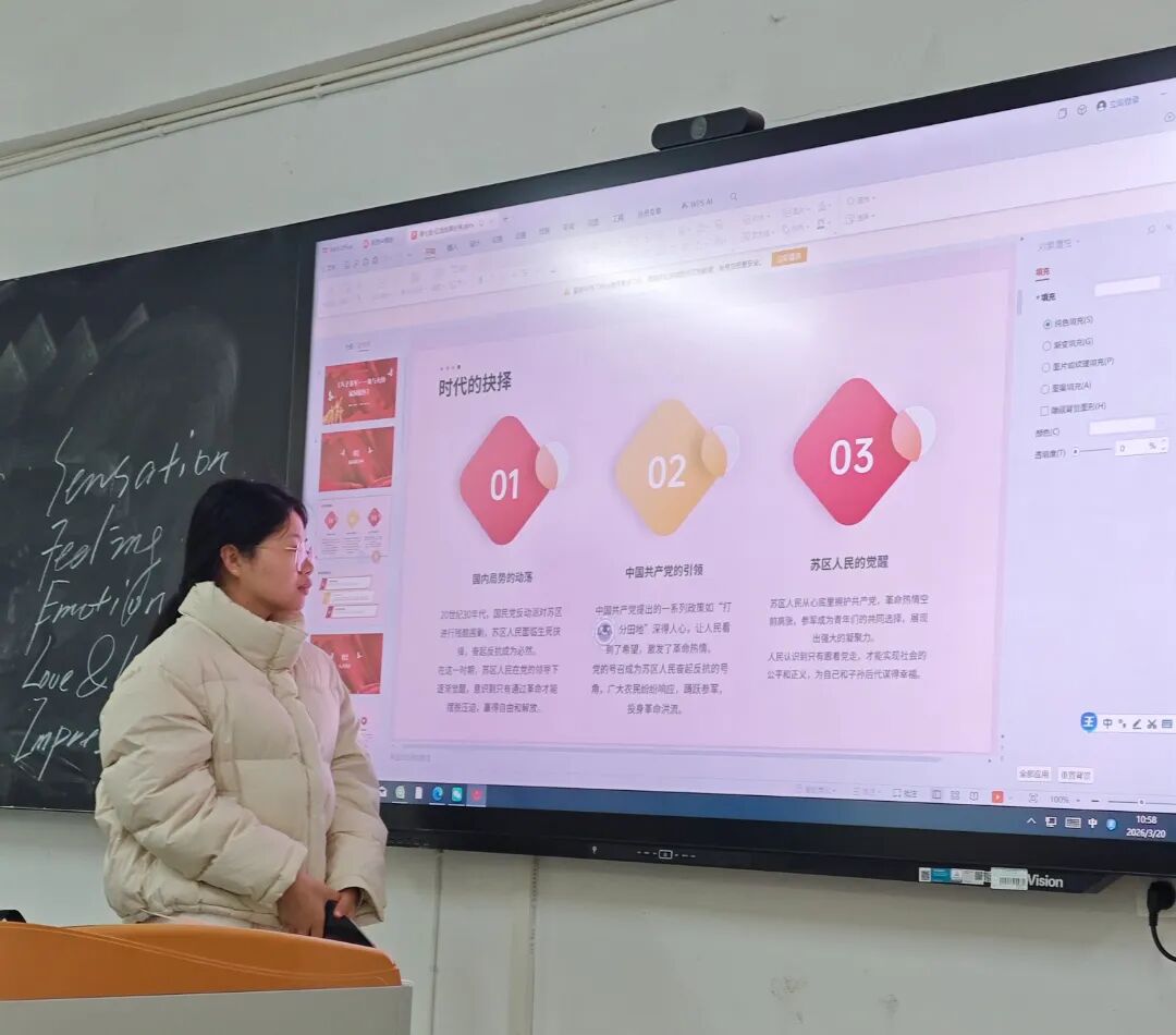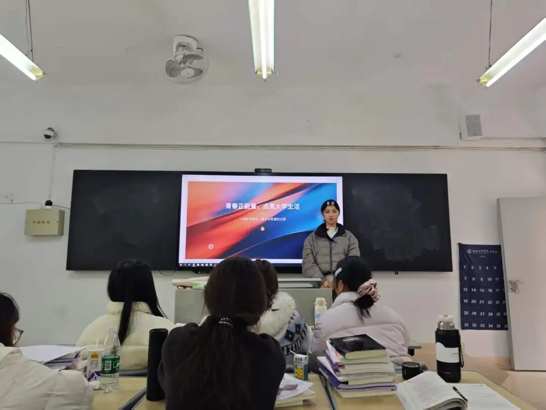 邓盈盈同学围绕“青春正能量,点亮大学生活”主题展开课前十分钟分享,结合自身成长经历,畅谈大学时光里的迷茫与探索、奋斗与收获,传递积极向上的青春态度。她从学业成长、生活规划、心态建设等方面分享实用经验,鼓励同学们以奋斗为笔、以热爱为光,拒绝躺平内耗,在大学时光里找准方向、向阳而行,引导全体同学以饱满的热情拥抱大学生活,用青春正能量书写属于自己的精彩篇章,营造了积极奋进的班级氛围。