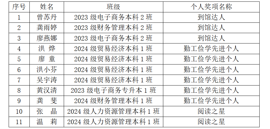 此外,多名学生在个人奖项评选中也表现优异。其中,“到馆达人”奖项的获得者们以极高的到馆频率展现了他们对知识的渴望和对图书馆资源的充分利用;“阅读之星”则以优异的阅读成果赢得了师生们的广泛赞誉;而“勤工俭学先进个人”则通过在图书馆的辛勤工作,不仅锻炼了自己的实践能力,也为图书馆的日常运营和服务提升做出了积极贡献。