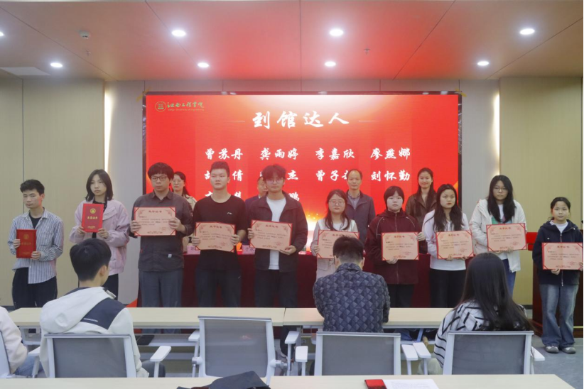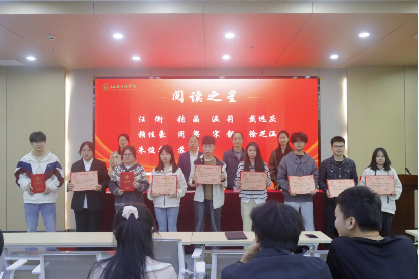 4月22日,江西工程学院2026年“书香润校迎评估 智读笃行育新人”读书月总结表彰会召开,经济管理学院在此次活动中表现突出,荣获“书香学院”称号,同时有多名学生分别荣获“到馆达人”“阅读之星”及“勤工俭学先进个人”等荣誉,充分展现了学院师生积极向上的精神风貌和浓厚的读书氛围。